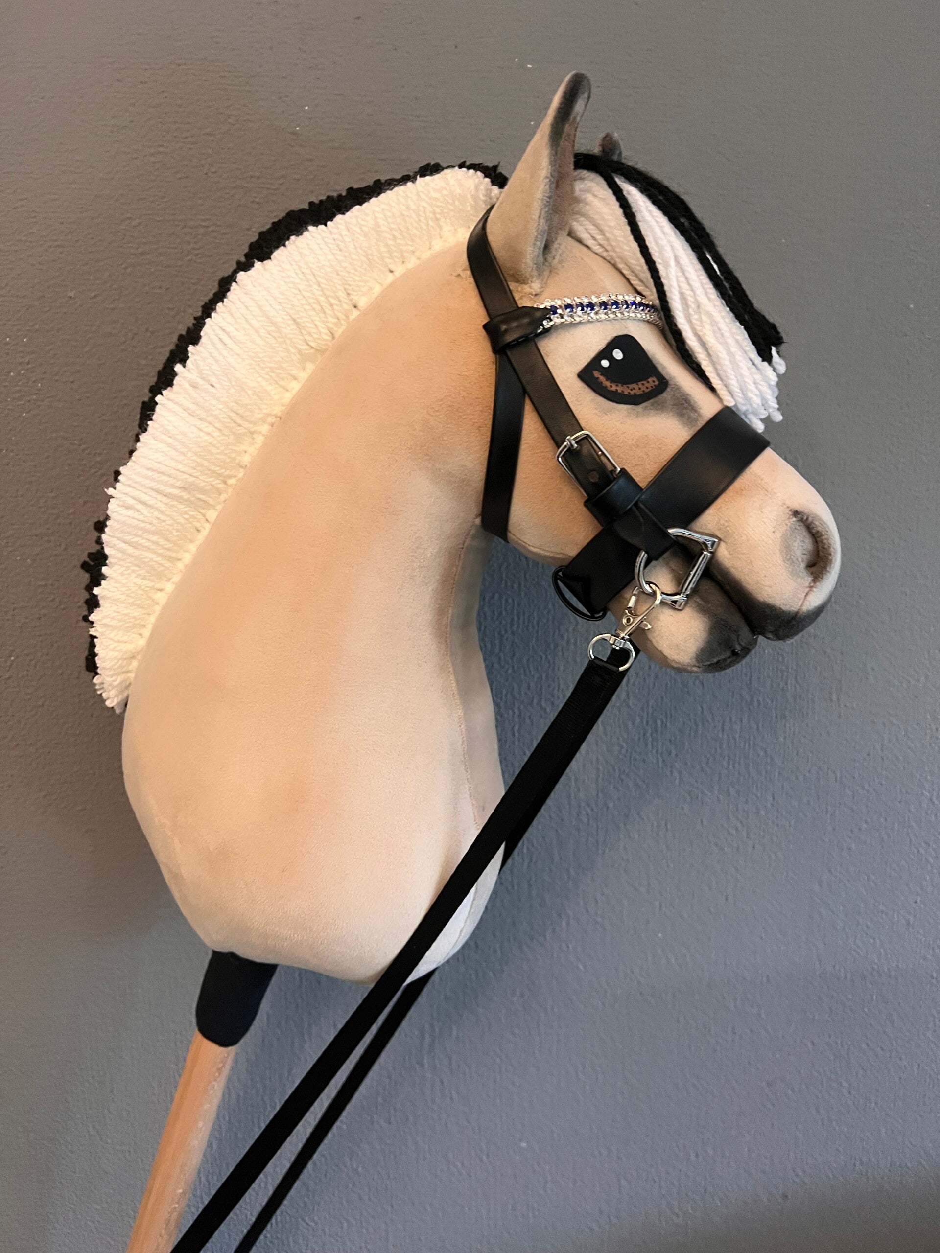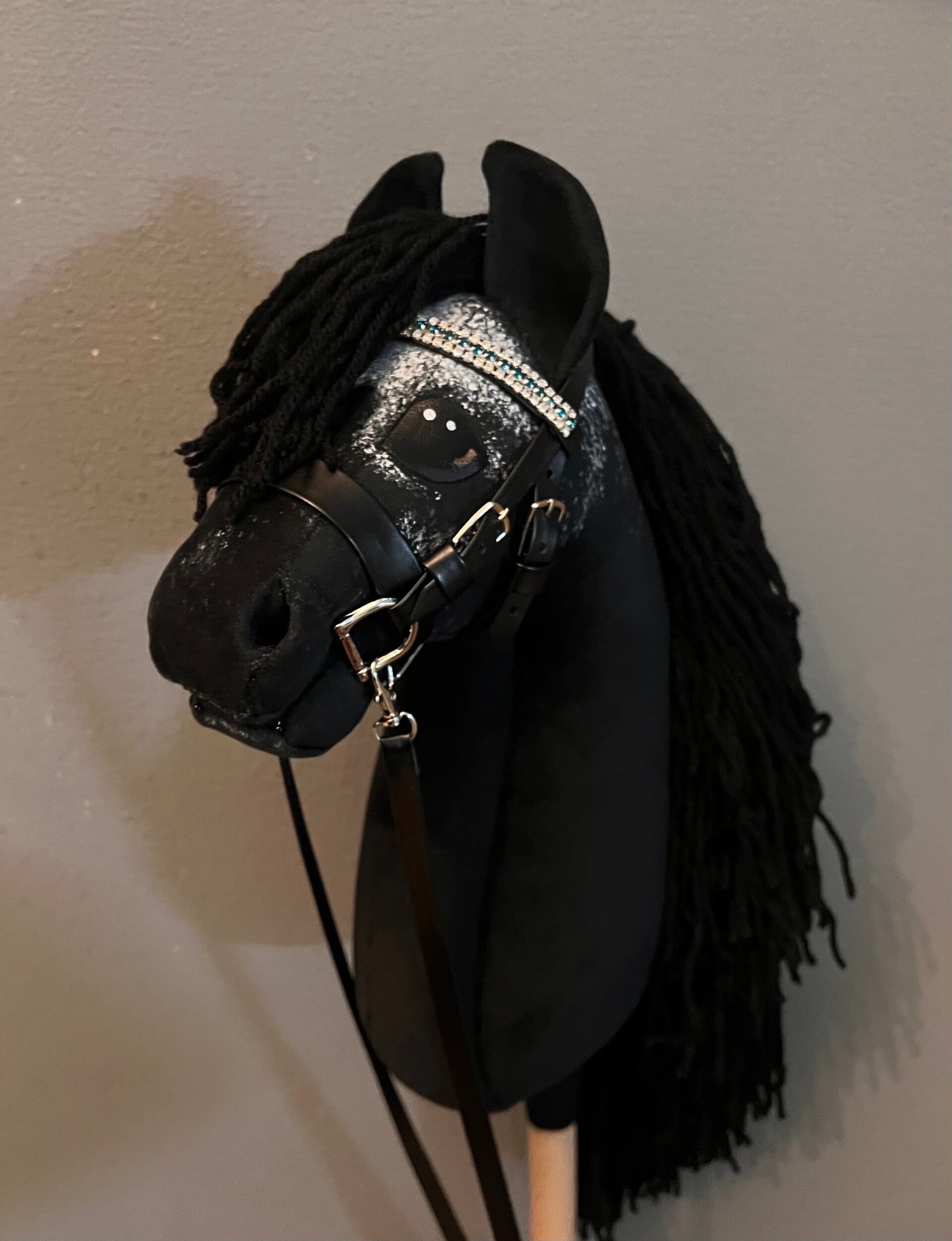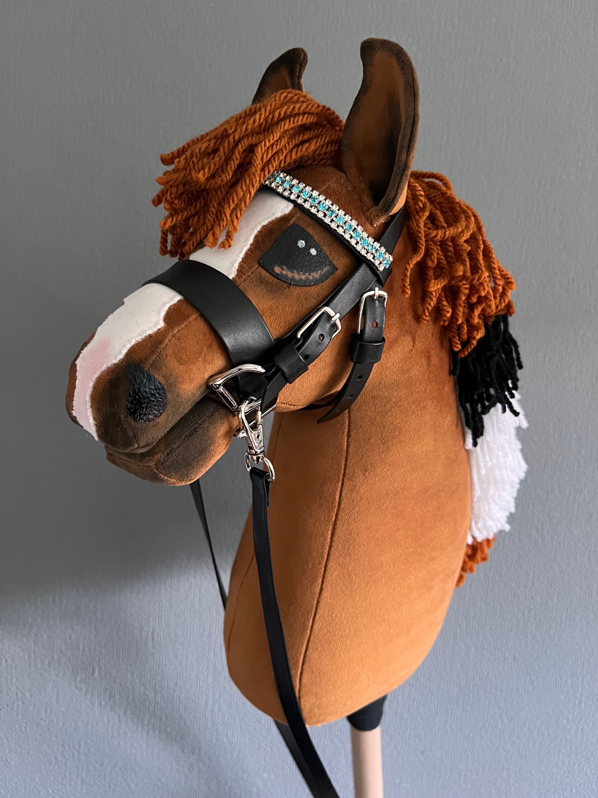Mooi luxe kunst lederen hobbyhorse hoofdstel voor jouw NG Hobbyhorse met echt bitje, afneembare teugels en trass-steentjes op de frontriem naar keuze.