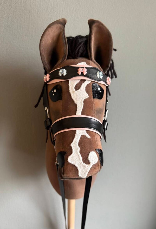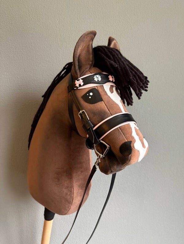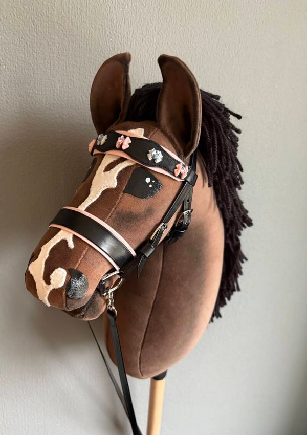 Nieuw in het assortiment! Luxe hoofdstel "Pink & Blue" met D-trens, afneembare teugels, zacht roze onderlegd, brede sierlijke frontriem met roze en blauwe strikjes! Dit hoofdstel is geschikt voor een formaat L (zie laatste foto's)